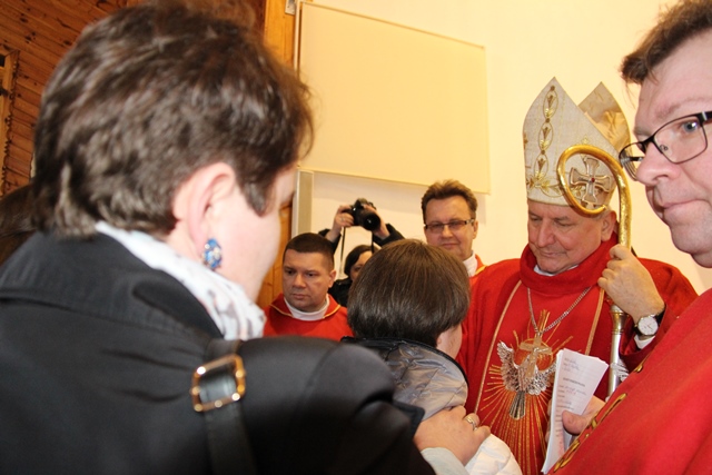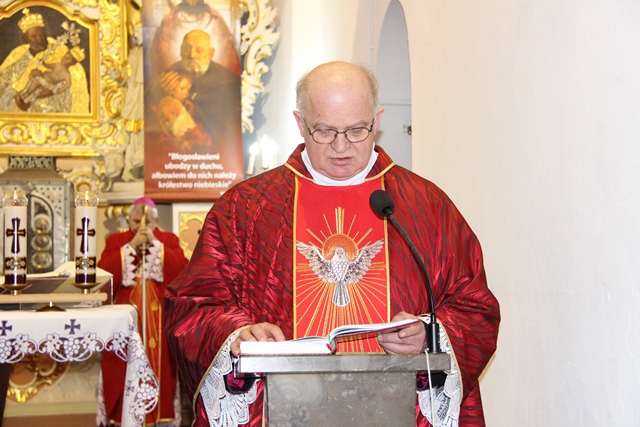 Witając biskupa kaliskiego, ks. prałat Marian Andrzejewski wyraził radość, że biskup kaliski przybył do prastarej świątyni romańskiej w Kościelcu Kaliskim w przededniu 25-lecia powołania do istnienia diecezji kaliskiej. Dodał, że w głównym ołtarzu tej świątyni znajduje się obraz św. Józefa z Dzieciątkiem z XVII w. Wymienił grupy duszpasterskie działające w parafii oraz wskazał na dokonania materialne w kościele i kaplicach filialnych. - Wszystkie te działania były możliwe dzięki dużej ofiarności, zaufaniu i wsparciu modlitewnym naszych parafian. Pragnę podziękować wszystkim parafianom za tworzenie klimatu serdeczności, ofiarności i dobre serce – powiedział proboszcz parafii pw. św. Wojciecha Biskupa w Kościelcu Kaliskim.