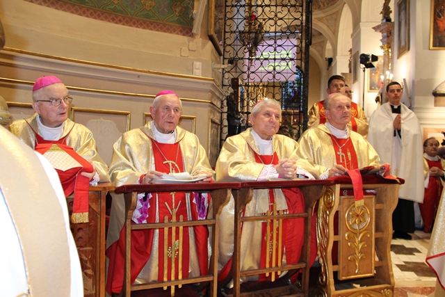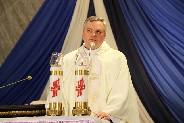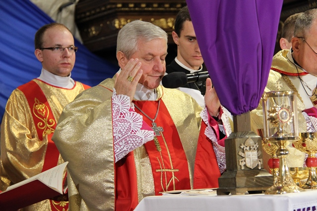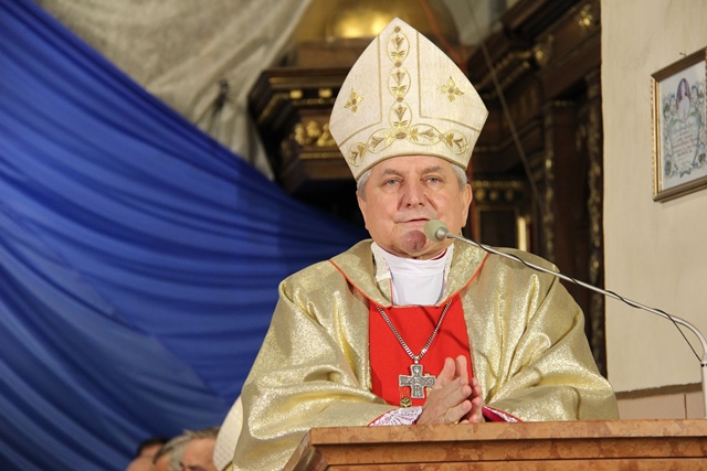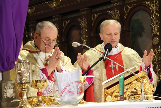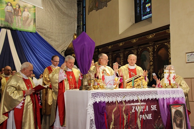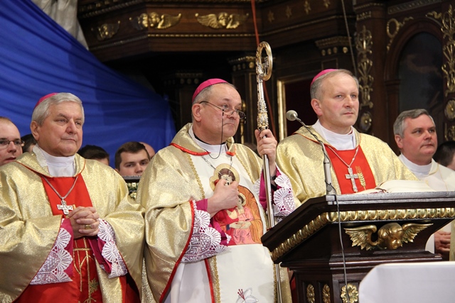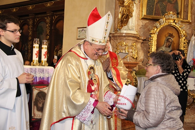 Mszy św. przewodniczył bp Michał Janocha, biskup pomocniczy archidiecezji warszawskiej, przewodniczący Rady ds. Kultury i Ochrony Dziedzictwa Kulturowego, na polu naukowym specjalista z zakresu historii sztuki i tradycji bizantyjskiej oraz teologii kultury. Wraz z nim modlili się: biskup kaliski Edward Janiak, bp Łukasz Buzun, bp senior Stanisław Napierała, bp senior Teofil Wilski, wikariusz generalny ks. prał. Andrzej Latoń, o. Tadeusz Rydzyk, kilkudziesięciu kapłanów, wierni z diecezji kaliskiej, a szczególnie dekanatów bolesławieckiego, pleszewskiego i zdunowskiego oraz pielgrzymi z całej Polski. W homilii celebrans odwołując się do obrazu Świętej Rodziny wskazywał na aspekt świętości jakim jest posłuszeństwo. - Posłuszeństwo zakłada słuchanie, a słuchanie zakłada rzadko praktykowaną dziś sztukę milczenia – stwierdził bp Janocha. Przedstawił cztery osoby, które dzięki posłuszeństwu doszły do świętości. Zaznaczył, że św. Brat Albert odkrył obraz Boga w drugim człowieku, zwłaszcza najbiedniejszym. Wskazał też na małżeństwo bł. Marię i Alojzego Quattrocchi wyniesionych na ołtarze przez papieża Jana Pawła II. Kolejną osobą zaprezentowaną przez biskupa była poetka Madeleine Delbrel, która jest kandydatką na ołtarze. Kaznodzieja odczytał wiersz jej autorstwa pt. „Taniec posłuszeństwa”. Przekonywał, że posłuszeństwo woli Bożej prowadzi człowieka do zbawienia. - W posłuszeństwo miłości wpisany jest krzyż i ten Jezus z krzyżem mówi nam jaka jest cena wypełnienia woli Bożej. Gdyby na tym się kończyło to chrześcijaństwo byłoby religią bardzo smutną, ale my idziemy ku zmartwychwstaniu – podkreślił bp pomocniczy archidiecezji warszawskiej. Przed zakończeniem Mszy św. biskupi, kapłani i wierni zebrani w kaliskiej bazylice zawierzyli św. Józefowi rodziny i dzieci nienarodzone.