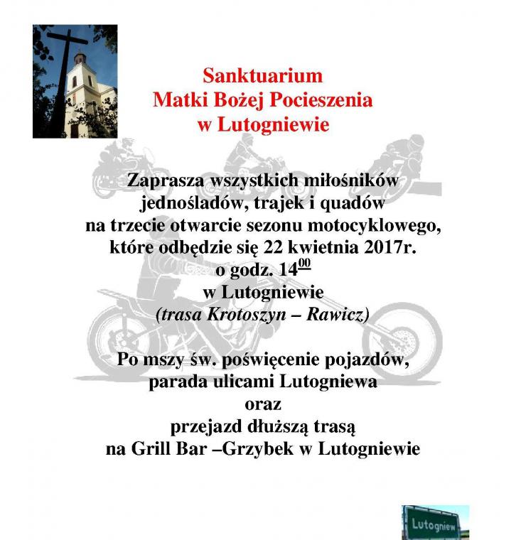 Wokół nas rozkwita przyroda. Cieszy oczy zieleń drzew i kolorowe kwiaty. Wszystko to zachęca, by wyruszyć doświadczać piękna świata stworzonego przez Boga. Można wyruszyć na piesze wędrówki, ale można także mniejszymi, czy większymi pojazdami jednośladowymi. Warto, by miłośnicy motocykli uczynili to z Bożym błogosławieństwem. W związku  z tym, już po raz trzeci Kustosz Sanktuarium Matki Bożej Pocieszenia w Lutogniewie zaprasza 22 kwietnia na godz. 14:00  wszystkich miłośników jednośladów: rowerów, motorów, trajek i quadów  na Msze Świętą z okazji otwarcia sezonu motocyklowego. Po Mszy Świętej poświęcenie wszystkich jednośladów parada ulicami Lutogniewa. Będzie i czas na wspólne spotkanie. A potem z Bożym błogosławieństwem, pod opieką Matki Bożej Pocieszenia, w duchu odpowiedzialności za najcenniejszy dar,  życie,  swoje i innych użytkowników dróg  można wyruszyć na szlak…