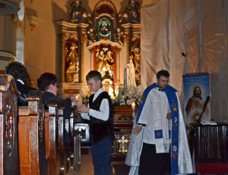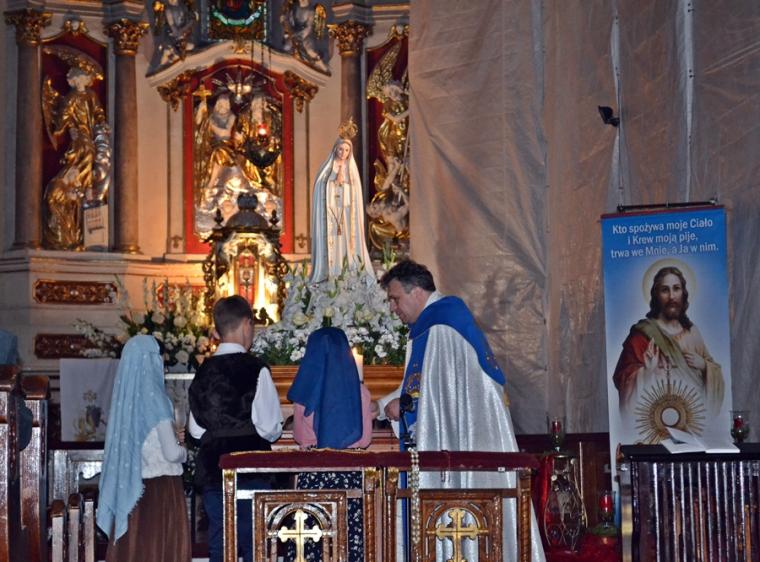 W rozważaniu poprzedzającym modlitwę różańcową ks. kan. Krzysztof przybliżył parafianom stan serc fatimskich pastuszków. Podkreślił, że byli  oni posłuszni swoim rodzicom, pełni prostoty i czystości. Jak wskazał, to zapewne było powodem tego, że to właśnie im Maryja powierzyła misje zaniesienia światu swego przesłania. W dalszej części rozważania ks. kanonik  przypomniał uczestnikom modlitewnego spotkania treść drugiego objawienia. Zaakcentował rolę i znaczenie ustanowienia nabożeństwa do Niepokalanego Serca Maryi. Podkreślając znaczenie wspólnoty i pracy nad sobą powiedział m.in. „ Nasza parafialna wspólnota ma również swoje serce. Ono bije  w każdym z nas. Wciąż uczymy się jaką powinniśmy być wspólnotą. Zadania te wynikają z naszego chrztu. Ponieważ jednak nasza ludzka natura skłonna jest do grzechu, dlatego wciąż modlimy się , pracujemy nad sobą, aby nasze serca były podobne do Serca Pana Jezusa i Niepokalanego Serca Maryi”.  Ks. kan. podkreślił, że w wielu miejscach, gdzie miały miejsce objawienia Matki Bożej gromadzą się tłumy wiernych, którzy chcą dotknąć tajemnicy Niepokalanego Serca Maryi.  Kończąc rozważanie ks. kan. powiedział:  „ My zgromadzeni na nabożeństwie fatimskim odmawiamy różaniec, śpiewamy pieśni maryjne, prosimy Maryję o wstawiennictwo u Trójjedynego Boga we wszystkich naszych potrzebach. Tym samym jesteśmy wspólnotą , której  celem jest sam Bóg”. Po zakończeniu rozważania rozpoczęliśmy modlitwę różańcową. Przy pięknie przyozdobionej figurze Pani Fatimskiej nie mogło zabraknąć pastuszków. W ich postacie wcieliły się dzieci z naszej parafii. Ku niebu popłynęła modlitwa, o którą nieustannie prosiła i prosi Maryja… W kontemplowaniu tajemnic różańca pomocne były rozważania ks. kanonika. Przed rozpoczęciem czwartej tajemnicy ks. kan. od świecy płonącej przy figurze odpalił świece pastuszków. Ci zanieśli to światło do uczestników nabożeństwa. Po zakończonej  modlitwie różańcowej wyruszyliśmy w procesji z figurą Fatimskiej Pani  zapalonymi świecami wokoło kościoła. Podczas procesji rozległo się bicie dzwonów w mikstackiej świątyni. Wzywają nas one i przypominają codziennie od dnia nawiedzenia o  Apelu Jasnogórskim. Gdy procesja powróciła do kościoła w duchowej łączności z Jasną Górą  śpiewaliśmy: Maryjo jestem, pamiętam, czuwam! Po końcowym błogosławieństwie wierni otoczyli figurę Fatimskiej Pani i zaśpiewali pieśń „ Zapada zmrok…”. Wypowiedziane  z życzliwością i uśmiechem słowa „ Dobrze, że jesteś”   do osób stojących najbliżej nas uświadomiły nam, że naprawdę jesteśmy wspólnotą. I jeszcze jedna refleksja. Pięknie prezentowała się udekorowana kwiatami Fatimska Pani, ale co najważniejsze otoczona była sercami kochających Ją ludzi.