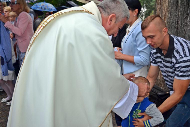 Czas wielkiego świętowania rozpoczął się procesją z Najświętszym Sakramentem i relikwiami Świętego Rocha z kościoła farnego do sanktuarium, zakończył jej powrotem. Zanim procesja z Najświętszym Sakramentem wyruszyła z sanktuarium do fary wyjątkowo gwarno zrobiło się wokół niego. W dniu uroczystości odpustowych przybyły wraz ze swoimi rodzicami do św. Rocha dzieci. Tu o godz. 18:00 ks. kan. Bogumił Kempa sprawował w ich intencji Mszę święta oraz skierował do wiernych rozważanie. Krótko po rozpoczęciu Eucharystii zaczął padać deszcz. Ksiądz Bogumił zaprosił dzieci, by zgromadziły się przy ołtarzu, bo zostało nad nim przygotowane zadaszenie. Na początku homilii kaznodzieja powiedział, że pierwszy raz głosi ją w takim towarzystwie. Wyraził radość z obecności tak wielu dzieci w sanktuarium u św. Rocha. Podkreślił, że dzieci przybyły tu po błogosławieństwo, które czyni człowieka szczęśliwym. Wyjaśniając istotę błogosławieństwa powiedział: „ Jeżeli błogosławię, to znaczy życzę komuś dobrze, życzę mu szczęścia. Przyszły tutaj te dzieci, aby mogły dostać Boże szczęście, dlatego tak ważna drodzy rodzice jest wasza obecność tutaj”. O tym jak ważne jest to, by rodzice błogosławili swoje dzieci mówił kaznodzieja w dalszej części rozważania. Zachęcał, by rodzice jak najczęściej błogosławili swoje dzieci. Dając świadectwo powiedział, że jego rodzice nadal błogosławią go, gdy wraca do domu, bądź z niego wyjeżdża. Stwierdził, że ważne jest to błogosławieństwo, bo uświadamia nam, że tylko Chrystus może dać nam prawdziwe szczęście. Nawiązując do postaci św. Rocha powiedział: „ Ten nasz wspaniały Patron, którego czcimy już od tylu dni jest tego dowodem. Ten człowiek doświadczył i cierpienia i złośliwości, doświadczył uwięzienia, doświadczył choroby. Doświadczył tego, że tak wielu ludzi się od niego odwróciło. A jednak jest błogosławiony, jest szczęśliwy”. W dalszej części rozważania ks. Bogumił zachęcał i prosił rodziców,aby uczestniczyli z dziećmi we Mszy św. i pokazywali im jak jest ona ważna. Podkreślił ponadto znaczenie przykładu rodziców i zachęcał, by klękali do modlitwy i uczyli jej swoje dzieci. Kończąc homilię kaznodzieja powiedział: „ Niech Boże błogosławieństwo z tego miejsca, z tego sanktuarium spływa na was, na wasze rodziny, na wszystkie dzieci, także na te nienarodzone, bo widzę że i takie też tu są. Niech Pan Bóg wam wszystkim błogosławi”. Została odmówiona specjalna modlitwa, a następnie kapłani udzielali dzieciom indywidualnego błogosławieństwa. Na pamiątkę spotkania u św. Rocha dzieci otrzymały obrazki. Były też i dla nich słodycze.