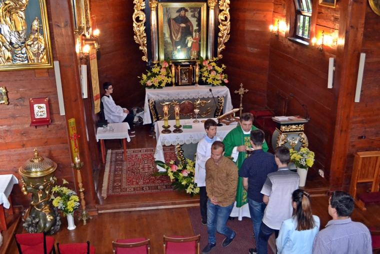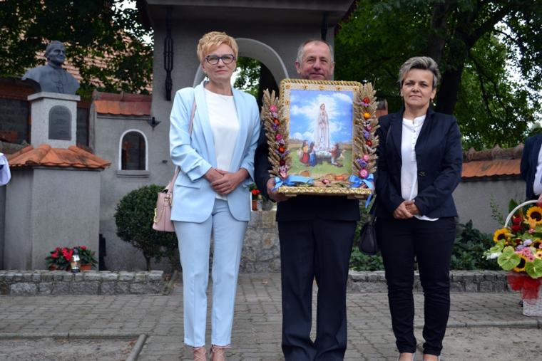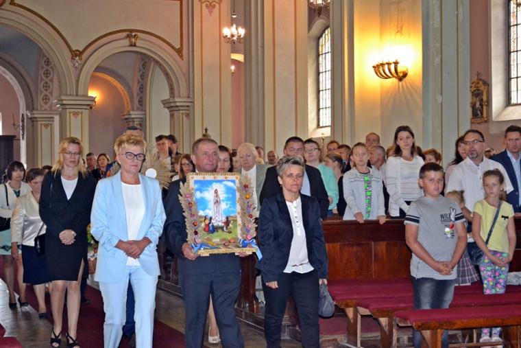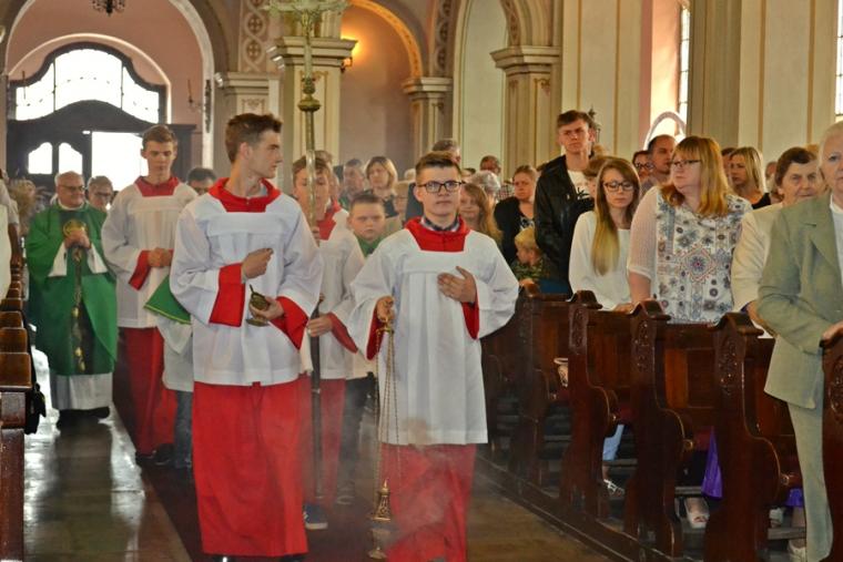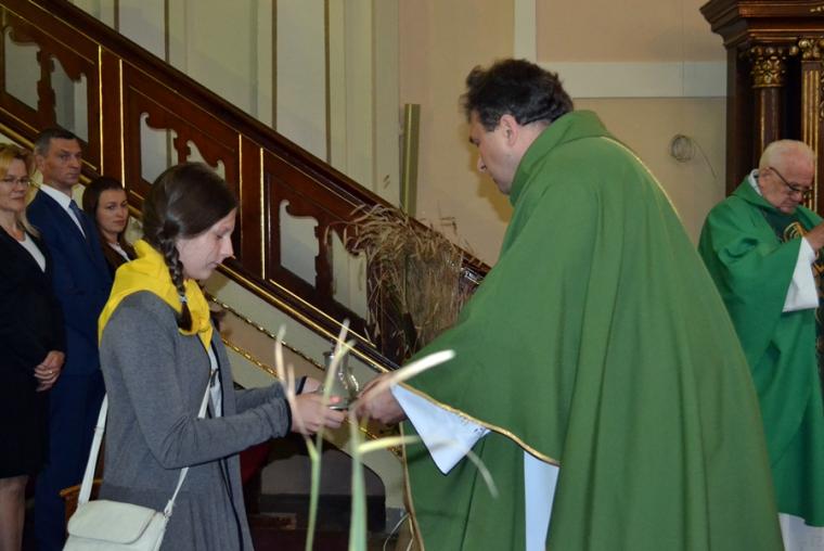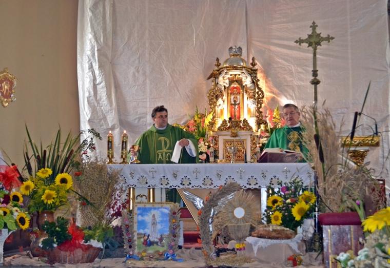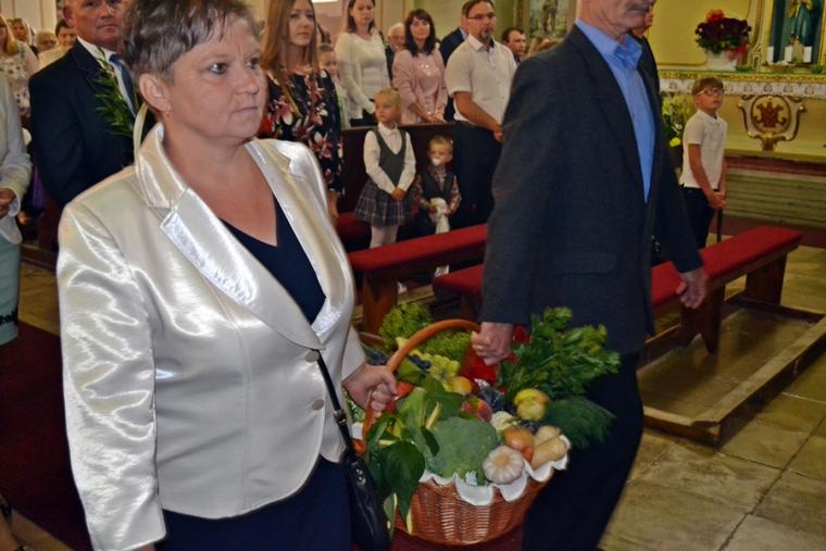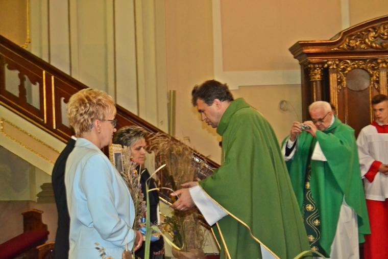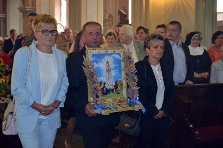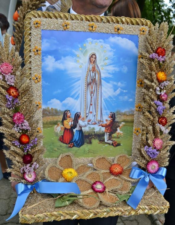 Przedstawiciele parafian z wieńcami żniwnymi, koszem kwiatów, koszem  owoców  i bochnem chleba zebrali się przy Grocie Matki Bożej, skąd procesjonalnie zostali wprowadzeni do kościoła. Wieńce żniwne symbolizują zebrany plon i koronują całoroczną pracę w polu.  Pierwszy wieniec nawiązywał do obchodzonego w tym roku Jubileuszu 100- lecia Objawień Fatimskich, drugi  został wykonany w kształcie kielicha i hostii.