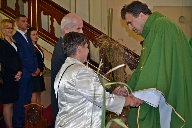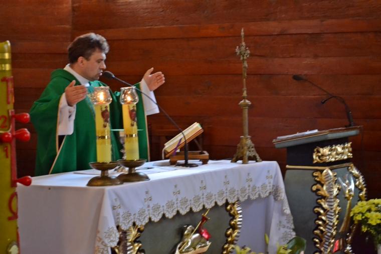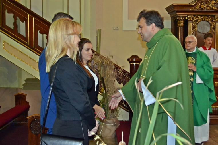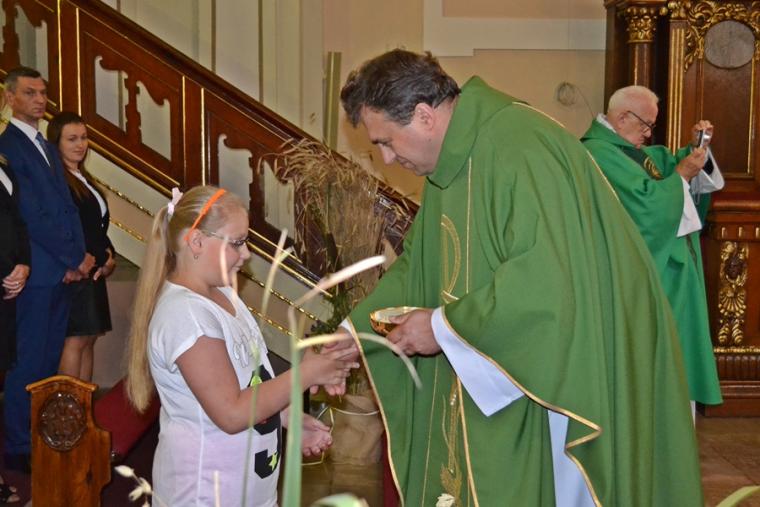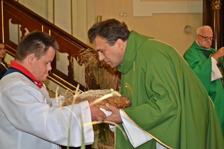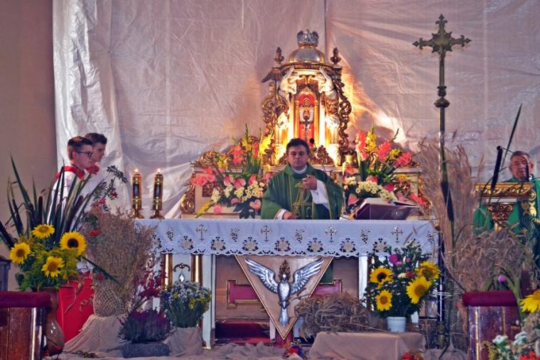 Homilię podczas tej  dziękczynnej Mszy św. wygłosił ks. wikariusz Krzysztof Lipiński. Nawiązując do słów Ewangelii podkreślił, że słuchając jej możemy odnieść wrażenie, że Pan Jezus ignoruje przychodzącą do niego z prośbą o pomoc kobietę, której córeczka jest opętana przez złego ducha. Zaakcentował, jednak, że Pan Jezus traktując ją w taki sposób chce dotrzeć do jej świadomości, zmusić ją do refleksji nad tym jak wygląda jej życie, co w nim powinno się zmienić. Podkreślił, że dziecko nie  jest zdolne do świadomego czynienia zła, w  związku z tym potrzebna jest przemiana duchowa tej kobiety. Gdy pojawia się w niej refleksja, chęć przemiany Jezus okazuje jej pomoc. Do refleksji nad tym, co powinniśmy zmienić w naszym życiu z pomocą Jezusa zachęcał zebranych  kaznodzieja. W drugiej części homilii w kontekście przeżywanego dziękczynienia za tegoroczne plony ks. Krzysztof zwrócił uwagę na zmiany jakie nastąpiły  w ostatnich latach. Podkreślił, że  zmieniło się spojrzenie na pracę, na siebie wzajemnie, ale także szacunek do chleba i tego wszystkiego co posiadamy. Zaakcentował, że zanika szacunek do jedzenia, dla chleba. Zwrócił uwagę, że kiedyś, gdy chleb upadł na ziemi podnosiło się go i z szacunkiem całowało. Współcześnie, jak podkreślił, nikt się tym nie przejmuje, można chleb podeptać. Rzadko można zobaczyć, że gdy dziecku spadnie chleb to go podniesie. Kaznodzieja zwrócił uwagę, że zanika szacunek dla pracy rolnika, ale jednocześnie na wsi nie szanuje się pracy ludzi  w mieście. Powiedział m.in. „ Brakuje nam wzajemnie szacunku do pracy, do samych siebie. Myślę, że sami zauważamy, że coś gdzieś  po drodze zagubiliśmy, że dzisiaj czasami nie szanujemy swojej pracy nawzajem. Brakuje wzajemnego zaangażowania, pomocy sobie nawzajem”. Ks. wikariusz zauważył, że bywa i tak, że ludzie którzy się angażują w życie parafii są krytykowani, wyśmiewani. Podkreślił, że kiedyś ludzie mieli satysfakcje, gdy mogli coś zrobić dla Pana Boga. Zwracając się do zebranych wiernych zaakcentował, że brak szacunku dla pracy innych, dla chleba, dla siebie nawzajem, jest złem na które często się zgadzamy. Zachęcił nas do refleksji, do postawienia sobie pytania czy powinniśmy się na to zło godzić,  a gdy uznamy, że taka postawa stanowi dla nas problem powinniśmy szukać pomocy u Jezusa, bo tylko On może coś zmienić w  naszym życiu. Kończąc homilię kaznodzieja powiedział: „ Jeśli chcemy, aby Pan Bóg uczynił nasze życie pięknym i dobrym, to prośmy o wszystko co się dzieje w naszym życiu, a przede wszystkim  o to, byśmy nie popadali w naszym życiu duchowym  w  rutynę, ale żebyśmy każdego dnia zachwycali się obecnością Pana Jezusa”. Wiele ważnych słów padło w tej homilii, do których warto wrócić. Pokazały nam one, jak z  pozoru proste gesty  mogą zmienić naszą rzeczywistość. Okazuje się, że czasami potrzeba tak  niewiele…