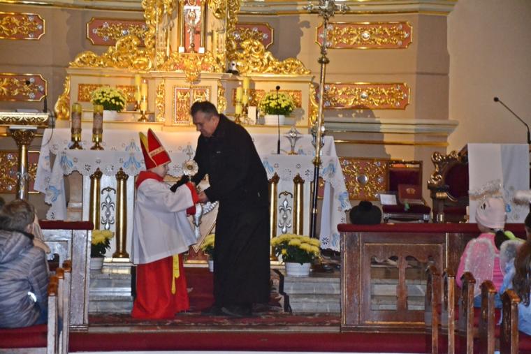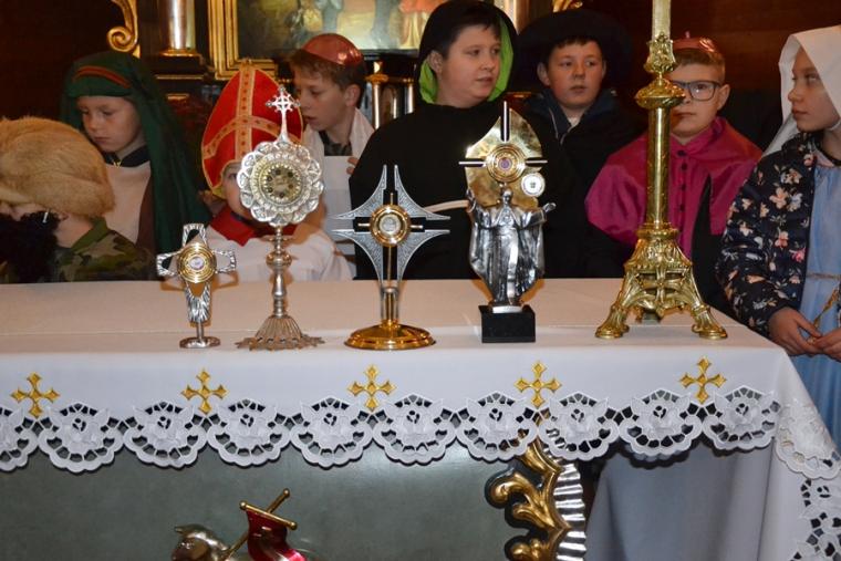 W parafii znajdują się relikwie św. Wojciecha, św. Zygmunta Szczęsnego Felińskiego, św. Maksymiliana Marii Kolbego, św. Jana Pawła II. Są i relikwie św. Rocha, ale te czekały na uczestników Marszu Świętych w sanktuarium. Zanim wyruszyliśmy na ulice miasteczka, ks. kan. Krzysztof Ordziniak, kustosz diecezjalnego Sanktuarium św. Rocha w Mikstacie przekazał relikwie tym dzieciom, które przebrały się za tych właśnie świętych. To te dzieci stanowiły czoło  mikstackiego Marszu Świętych. Za nimi szły dzieci, które przebrały się  za Świętego Rocha, patrona naszego sanktuarium, ale i miasta. Byli oczywiście i inni święci.