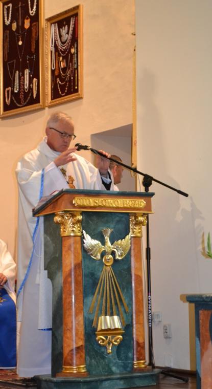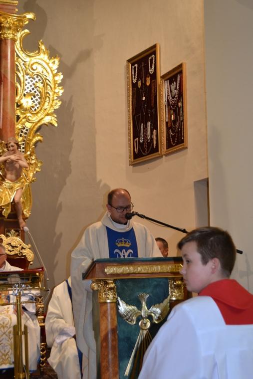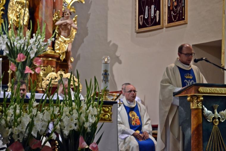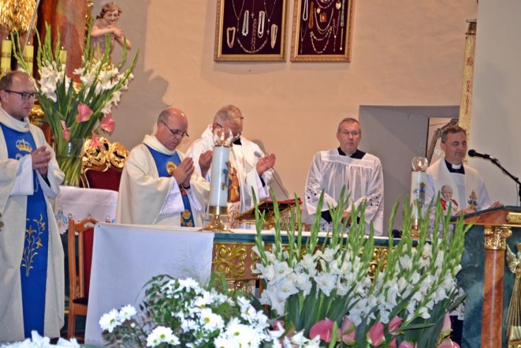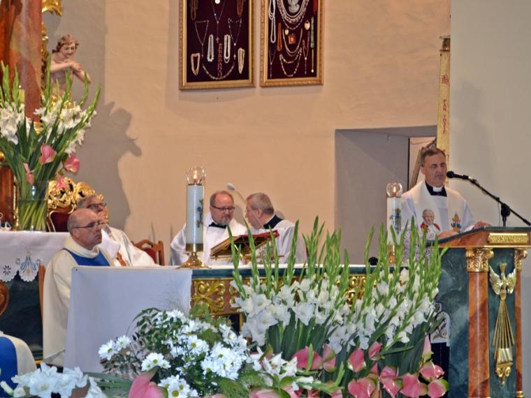Przed rozpoczęciem Eucharystii słowa podziękowania za przybycie skierował do zebranych w sanktuarium ks. kan. Adam Kosmała. Zachęcał wiernych do przedstawiania Maryi swoich próśb o potrzebne łaski. Podziękował parafianom za przygotowanie kościoła do uroczystości odpustowych, podkreślając, że to dzięki ich zaangażowaniu prezentuje się on tak pięknie. Po odsłonięciu obrazu rozpoczęła się suma odpustowa. Sumę odpustową koncelebrowało czterech kapłanów. Koncelebrze przewodniczył ks. kan. Jacek Stawik, proboszcz parafii Jaraczewo. Współcelabransami byli ks. kan. Krzysztof Ordziniak, ks. kan. Przemysław Talaga i ks. Paweł Wczesny. W czasie sumy homilię wygłosił ks. kan. Jacek Stawik. Rozpoczynając podkreślił, że lektura Pisma Świętego pokazuje,że Pan Bóg chce na ziemi miejsc, w których będzie szczególnie obecny, w którym będą gromadzili się wierni jako lud, jako bracia, jako rodzina. Zaakcentował, że takim miejscem jest Kotłowskie Wzgórze. Przyznał, że sam to miejsce dopiero odkrywa. Podzielił się swoimi lękami, niepokojami związanymi ze wspomnieniami z początków podziału kościoła. Przyznał, że bał się tego miejsca, a jak podkreślił jest ono piękne, przepełnione miłością, bo jest domem Matki. Tutaj, jak podkreślił czcimy Ją, pozdrawiamy, ale także poznajemy, doświadczamy, że Jej życie miało głęboki sens, zostało uhonorowane chwałą nieba i przebywaniem przy Bogu. Nawiązując do przeżywanej uroczystości kaznodzieja przypomniał, że w liturgii wspominamy dzień narodzenia Maryi. Kontynuując powiedział: „ Liturgia jest czymś niezwykłym. Jest działaniem Boga i naszym. My się gromadzimy mając dobrą wolę, coś czytamy, mówimy, wykonujemy biblijne gesty, a Bóg działa i czyni obecnym to wszystko co się już wydarzyło. Dodał, że liturgia dnia dzisiejszego przenosi nas w dzień narodzin, który jest dniem radości i wielkiego szczęścia. Ks. kan. Jacek zaakcentował, że Maryja była jutrzenką, czyli Tą, która poprzedza słońce, Tą, która porodzi Zbawiciela. Nawiązując do słów Ewangelii- rodowodu Jezusa Chrystusa podkreślił, że jest w nim wiele ważnych, cennych informacji. Zawiera on tajemnice powołania. Zwrócił uwagę, że współczesny człowiek żąda świata idealnego. Okazuje się jednak, że w opisie rodowodu Jezusa nie występują osoby, które wcale nie były idealne, nie były święte. Podkreślił, że na początku i na końcu opisu rodowodu są osoby święte: Abraham, którego wiara jest dla nas wzorem i Maryja. Kontynuując kaznodzieja zwrócił uwagę, że my także wpisujemy się w ten rodowód, gdyż Zbawca ciągle się objawia. Ks. kan. Jacek zachęcał zebranych, by podjęli refleksję nad tym jak wpisują się w ten rodowód. Dodał, że dobrze będzie zapytać Maryi, jak wpisać się w ten rodowód. Podkreślił, że Maryja prowadziła proste, zwyczajne życie, w które wpisana była pokora, radości, cierpienia. Jej życie przepełnione było szacunkiem i miłością do Józefa. Kontynuując kaznodzieja podkreślił, że prawdziwym pięknem Maryi jest prawda. Powiedział: „ Bóg jest Bogiem, Ona jest człowiekiem. Wie, że wszystko pochodzi od Boga. Jest pokorną służebnicą”. Zwrócił uwagę, że źródłem Jej piękna było słowo Boże, które rozważała, którego słuchała i które przyjmowała i realizowała w swoim życiu. W dalszej części homilii celebrans z naciskiem podkreślił, że Bóg jest w niebie, nikt z nas nie jest Bogiem. Skierował do zebranych w świątyni pytanie jak ta prawda, że Bóg jest tylko jeden porządkuje ich życie. Tą prawdą- jak podkreślał żyła Maryja, dlatego powinniśmy się Nią zachwycać. Kontynuując powiedział: „Ciągle jesteśmy na jakimś rozdrożu, jesteśmy karmieni różnym rzeczami, różnymi sprawami. Jesteśmy nieraz karmieni dziełami ciemnymi, wypalonymi, pustymi. Stąd wiele beznadziejności”. Podkreślił, że czasy współczesne są największym kryzysem cywilizacyjnym. Zaakcentował, że człowiek współczesny ma tendencję do urządzania świata na nowo, odrzucając Pana Boga. Kontynuując dodał, że jesteśmy uwikłani w ten kryzys cywilizacji i nie pozostaje on bez wpływu na nasze życie. Podkreślił, że fakt iż jesteśmy u Matki Bożej wskazuje, że kroczymy drogą prawdziwą, tą, która zaprowadziła Maryję do królowania w niebie.