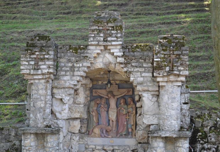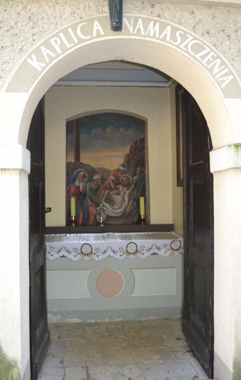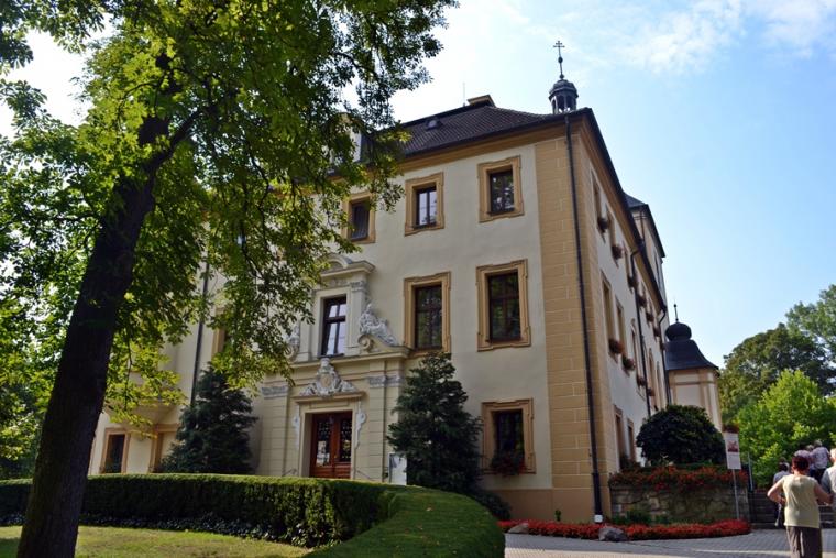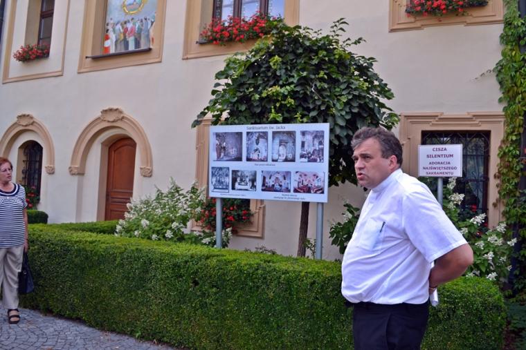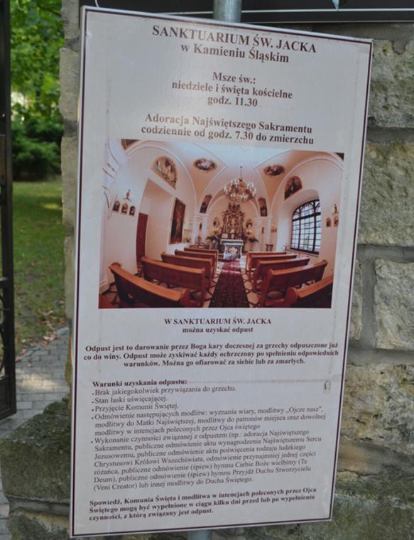 Kolejnym miejscem, które nawiedziliśmy był Kamień Śląski. Tu na świat przyszedł przyszły święty Jacek Odrowąż, bł. Czesław i bł. Bronisława. Kaplica poświęcona św. Jackowi powstała w XVIII wieku.  Zachwyca swoim wystrojem. W centralnym  punkcie ołtarza umieszczona jest  statua św. Jacka. Po jej bokach znajdują się figury bł. Czesława i bł. Bronisławy. Na sklepieniu kaplicy podziwiać można przepiękne malowidła przedstawiające cztery sceny z życia Maryi: „Zwiastowanie", „Narodziny Jezusa w Betlejem", „Ofiarowanie Jezusa w świątyni", „Śmierć Maryi-Wniebowzięcie". W kaplicy codziennie  od rana do zmierzchu odbywa się adoracja Najświętszego Sakramentu. Oczywiście nawiedziliśmy kaplicę sanktuarium św. Jacka, pokłoniliśmy się Jezusowi ukrytemu w Najświętszym Sakramencie. Wspólnie odmówiliśmy litanie do św. Jacka, a następnie był czas na indywidualna modlitwę oraz chwilę odpoczynku w parku pałacowym. Miejsce przepiękne, a niewielka kaplica stwarza atmosferę do refleksji i modlitewnej zadumy. Otaczający pałac park ze starymi drzewami i ptactwem pozwalał  zachwycić się pięknem świata stworzonego przez Boga. Przemierzając alejki, w cieniu drzew w niewielkiej kapliczce można było spotkać Chrystusa frasobliwego. Dobrze nam było u św. Jacka w Kamieniu Śląskim, ale trzeba było wyruszyć dalej na pielgrzymi szlak.