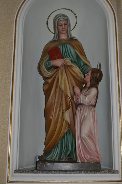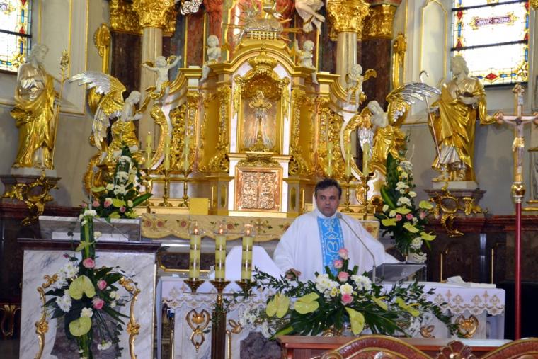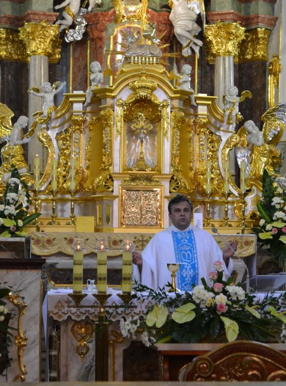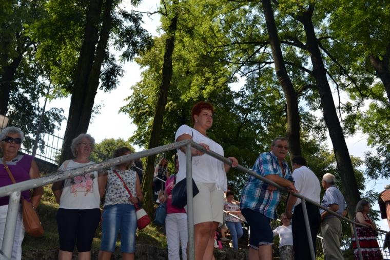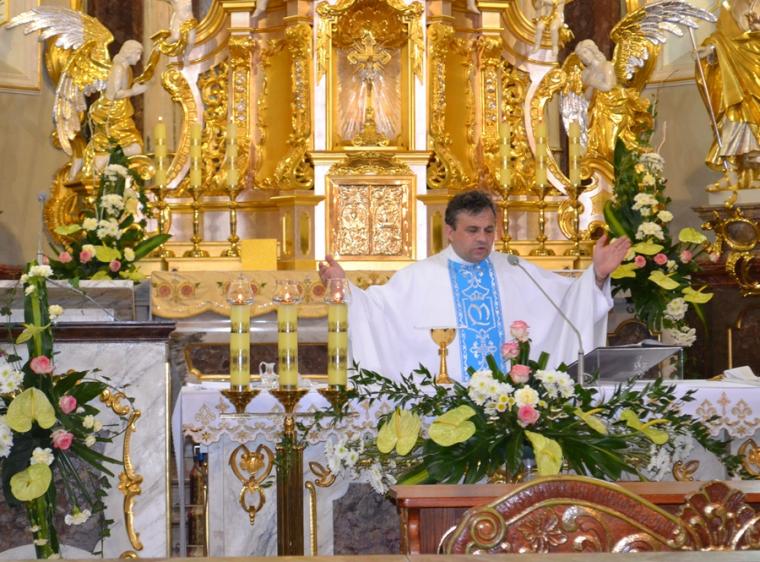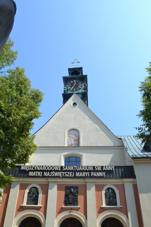 Następnie udaliśmy się na  Górę Świętej Anny. Czekała tam na nas Babcia Jezusa, jej córka Maryja i Boski wnuk Jezus. Chociaż właściwie powinniśmy wymienić ich w odwrotnej kolejności, bo Anna Samotrzecia w swojej figurze pokazuje nam właśnie na Jezusa i Maryję. Ona sama stoi tuż za nimi. Po przybyciu na Górę Świętej Anny udaliśmy się do bazyliki. Stąd po przywitaniu i modlitwie udaliśmy się do Groty Lourdzkiej. Był czas na nawiedzenie kapliczek kalwaryjskich i indywidualną modlitwę w bazylice. Każdy z nas wyruszał na pielgrzymi szlak chcąc przedstawić przez wstawiennictwo świętych Bogu swoje intencje. Ważny był zatem ten czas na indywidualną modlitwę. O godzinie 14:30 w bazylice św. Anny przeżywaliśmy najważniejsze wydarzenie pielgrzymkowego dnia- Eucharystię. Sprawował ją we wszystkich naszych intencjach ks. proboszcz Krzysztof Ordziniak. Rozpoczynając  mszę świętą podkreślił, że przybyliśmy na tę Górę, by uczcić świętą Annę  matkę Maryi i babcię Jezusa, by jej powierzyć nasze radości i troski. W rozważaniu ks. kan. Krzysztof przypomniał, że pielgrzymowaliśmy do trzech Świętych. Nasz pielgrzymi szlak rozpoczęliśmy od Dobrzenia i spotkania ze św. Rochem, który patronuje naszemu miastu, następnie był Kamień Śląski i spotkanie ze św. Jackiem. Wreszcie dotarliśmy na Górę Świętej Anny. Podkreślił, że chronologicznie trasa naszego pielgrzymowania powinna rozpocząć się na Górze Świętej Anny. Zaznaczył, że Biblia nie przekazuje nam informacji o Annie i Joachimie, ale wiadomo, że długo oczekiwali na Maryję. Zwrócił uwagę, że podobnie było w życiu rodziców naszego niebieskiego Patrona, którzy uprosili sobie potomka właśnie za wstawiennictwem Maryi. Kontynuując ks. kanonik zaakcentował, że rodzice Maryi musieli być ludźmi świętymi, skoro przekazali życie tej,  która zrodziła Zbawiciela. Podkreślił, że Maryja była służebnicą Pańską, tą, która potrafiła bezgranicznie zaufać Bogu. Zapewne tego zaufania uczyła się w domu, od swoich rodziców. Kaznodzieja zwrócił uwagę, że św. Anna jest tą, która uczy nas zaufania. Zachęcił, byśmy będąc w tym szczególnym miejscu prosili o umiejętność zaufania Bogu. W dalszej części rozważania ks. kan. Krzysztof prosił św. Annę, by w sposób szczególny wspierała tych, którzy są babciami i dziadkami, od których wiele zależy. Podkreślił jednocześnie, że ich rola we współczesnym świecie jest trudna, gdyż młodzi nie zawsze chcą przyjmować ich wskazania. Celebrans zwrócił uwagę na znaczenie modlitwy. Kończąc  przywołał słowa pieśni śpiewanej często w sanktuarium: „Niech się co chce ze mną dzieje, w Tobie święta Anno, mam nadzieję”. Są one, jak podkreślił, wyrazem naszego zaufania do św. Anny. Przed końcowym błogosławieństwem ks. kan. Krzysztof odmówił modlitwę pielgrzyma przez wstawiennictwo św. Anny.