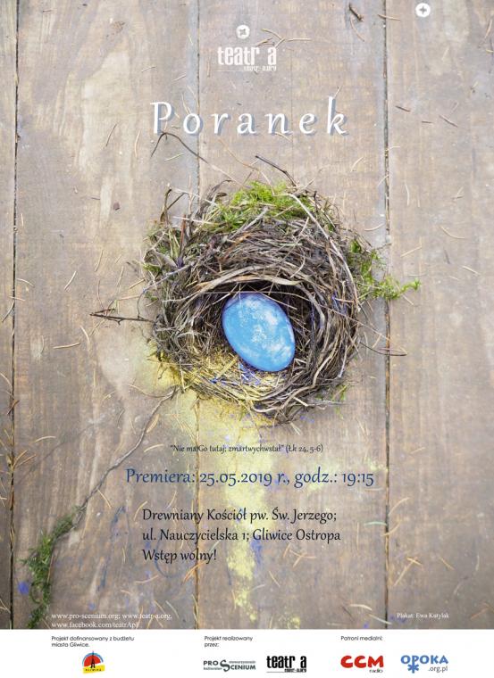 Podejmując się tego tematu po wielu latach od czasu premiery spektaklu „Pasja” w interpretacji Teatru A, świadomie (w treści i formie) do tego niezwykle ważnego dla artystów, ale i dla widzów/uczestników przedstawienia nawiązując, przygotowaliśmy misterium... twórcy „Poranka” stawiają sobie pytanie o to „co dalej?”... pytają o pierwsze reakcje uczniów, o radosne, a jeszcze pełne obawy pomieszanie niewiast u grobu, o „niewiarę” Tomasza, potrzebującego namacalnie uwierzyć w Zmartwychwstałego. A że wszystko to artyści starają się podać lekko, z przyjaźnią uśmiechając się do Świętych - świadków Jezusa... nie ma w tym nic zdrożnego, ba, nawet jest liturgiczne przyzwolenie...