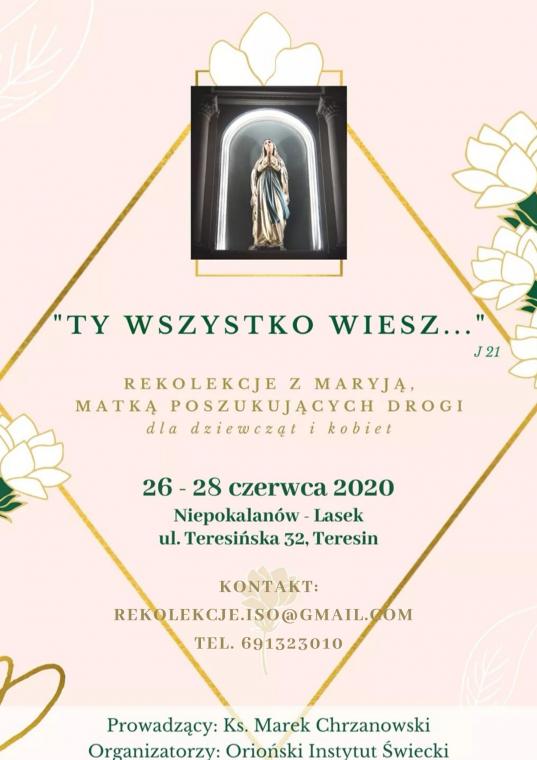 "Niepokalanów - Lasek to urokliwe miejsce niedaleko Warszawy, związane z o. Maksymilianem Marią Kolbe (niedaleko mieści się Sanktuarium) i z franciszkanami. W domu jest kaplica, na zewnątrz leśny park, gdzie można pomedytować albo odprawić Drogę Krzyżową czy Różaniec. W maju i czerwcu uroku dodaje śpiew ptaków i zapach kwiatów. To właśnie tam zapraszamy dziewczyny  i kobiety, które chcą w bliskości Maryi zastanowić się nad swoim życiem i pytać Pana Boga o to, co dalej" - podkreślają organizatorzy rekolekcji.  "Spotkajmy się przy sercu Maryi w urokliwym miejscu, gdzie w czerwcu jest wciąż maj – w Niepokalanowie koło Warszawy, a dokładniej w “Lasku” (Niepokalanów – Lasek, ul. Teresińska 32, Teresin) od 26 do 28 czerwca 2020 roku" - zachęcają.