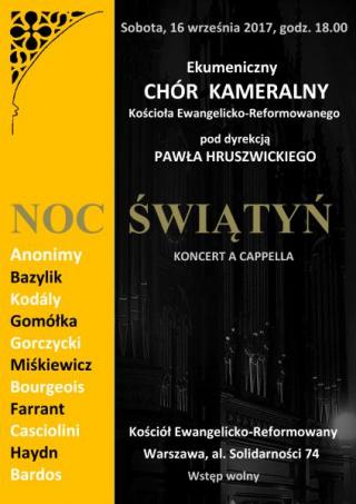 W sobotę, 16 września br., odbędzie się trzecia edycja Nocy Świątyń, wieloreligijnego święta, w którym uczestniczy Parafia Ewangelicko-Reformowana. W godzinach 18.00 - 22.00 można będzie odwiedzić kościół, wysłuchać występu Ekumenicznego Chóru Kameralnego