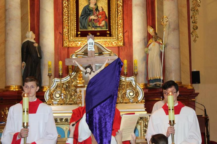 Centralnym wydarzeniem liturgii wielkopiątkowej jest adoracja Krzyża. Ks. kan. Łukasz stopniowo odsłaniając ramiona Krzyża śpiewał trzykrotnie: „Oto drzewo Krzyża, na którym zawisło zbawienie świata”, na co wierni odpowiadali: „Pójdźmy z pokłonem”. Krzyż wystawiony w widocznym i dostępnym miejscu, wierni mogli adorować do godziny 21:00.